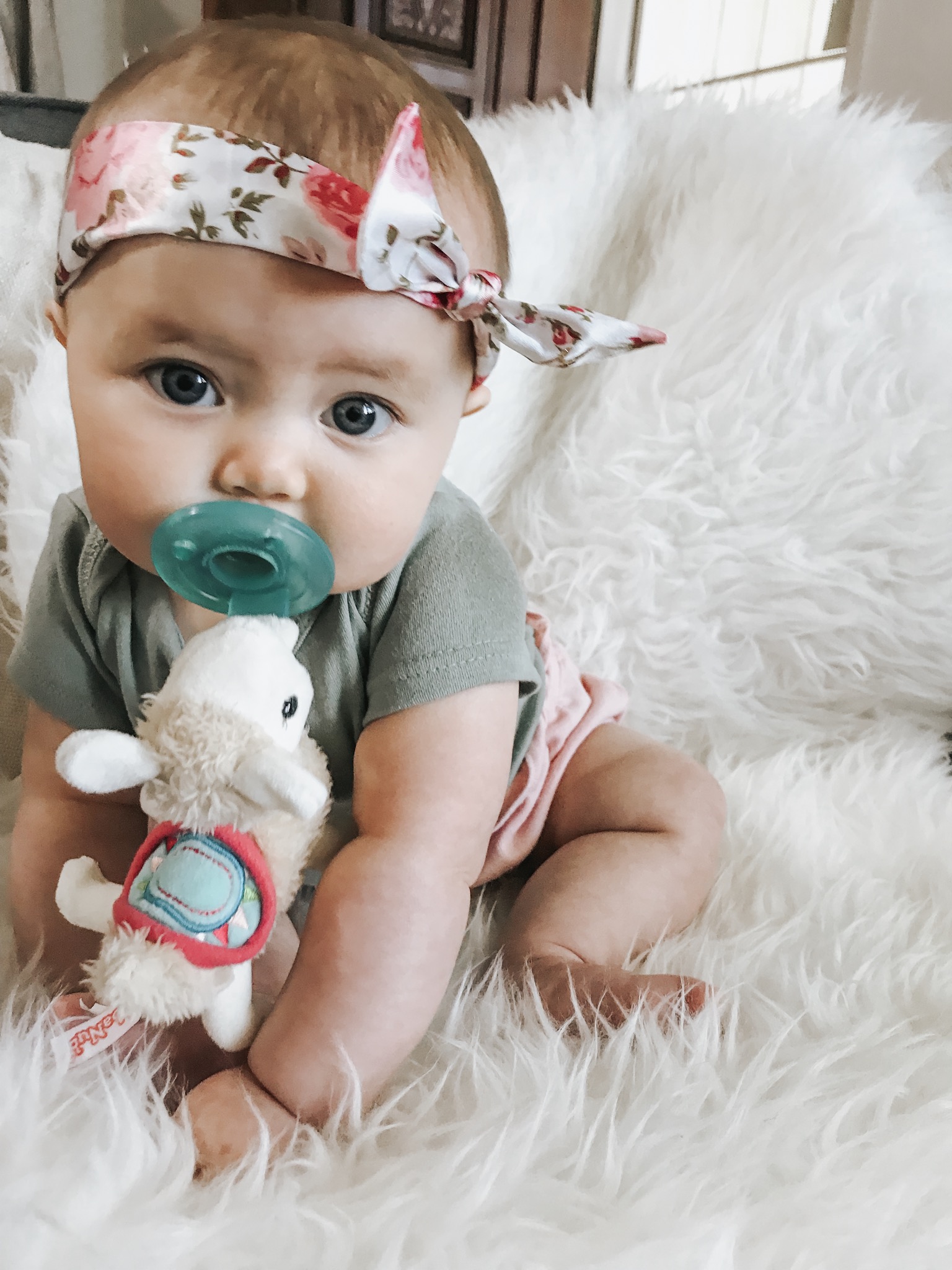 These pacifiers have saved our lives! M has 3 of them (a pink elephant, monkey and a llama) and she insists on sleeping with all of them. It’s so cute to watch her wake up and decide which one she wants to take that day. The stuffies attached to the pacifiers helped her be able to hold it herself and put it back in her mouth when she was fussy. Whether you’re pro pacy or not, this is the GREATEST baby shower present!